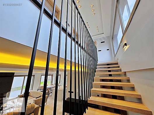 Modern mimarinin en şık örneklerini sunan iç mekan, ferahlık ve fonksiyonelliği bir araya getiriyor:Galeri Boşluğu Etkisi: Merdiven alanında tavana kadar uzanan dikey metal korkuluklar ve “yüzer merdiven” (floating stairs) tasarımı, eve girdiği anda modern ve endüstriyel bir şıklık katar.
